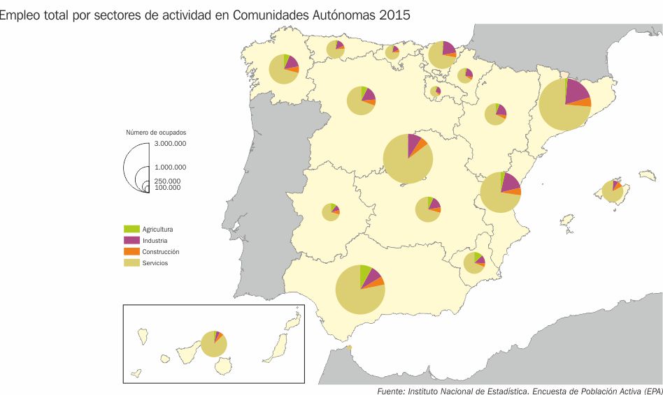 Empleo total por sectores de actividad en Comunidades Autónomas 2015