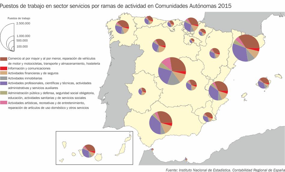 Puestos de trabajo en sector servicios por ramas de actividad en Comunidades Autónomas 2015