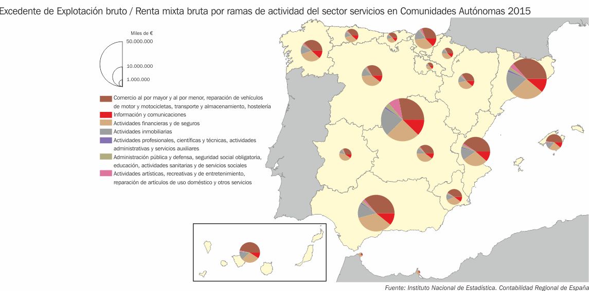 Excedente de Explotación bruto / Renta mixta bruta por ramas de actividad del sector servicios en Comunidades Autónomas 2015