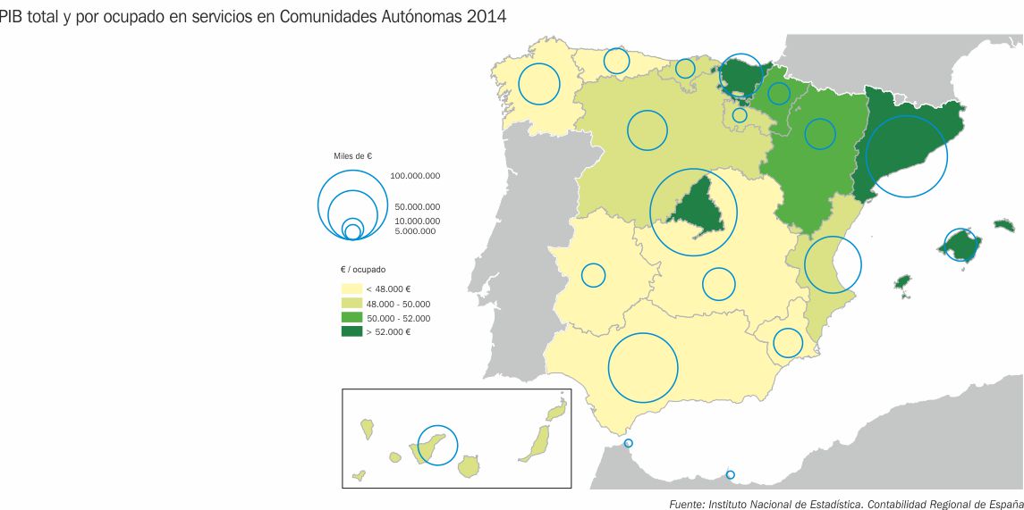 PIB total y por ocupado en servicios en Comunidades Autónomas 2014