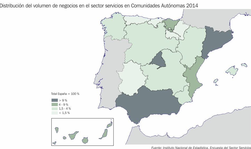 Distribución del volumen de negocios en el sector servicios en Comunidades Autónomas 2014